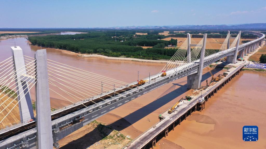 6月14日,在濟鄭高鐵山東段長清黃河特大橋,中鐵十局的工作人員進行鐵軌鋪設作業(無人機照片)。
