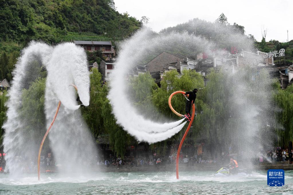 6月17日,工作人員在鎮遠古城?陽河畔進行水上飛人表演。