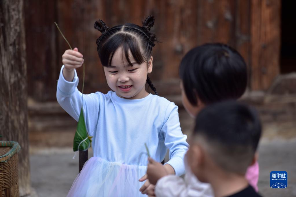 6月16日,小朋友在鎮遠古城?陽河畔體驗包粽子。