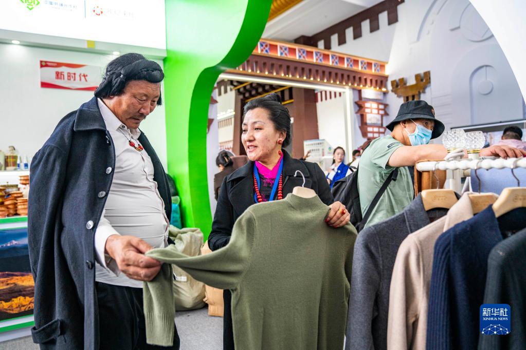 6月17日,工作人員在第五屆藏博會現場向顧客介紹產自阿里地區的羊絨衫產品。