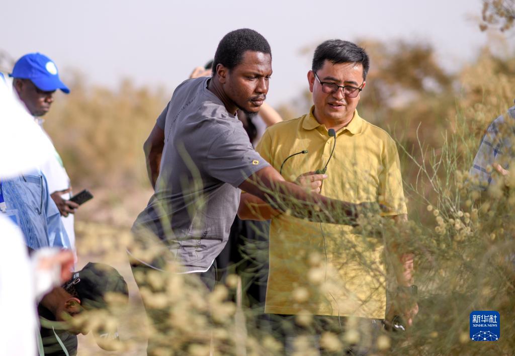 在中科院新疆生態與地理研究所策勒沙漠研究站天然實驗區,買爾當(右一)為參加第二屆非洲綠色長城建設技術培訓班的學員講解(6月13日攝)。新華社記者 王菲 攝