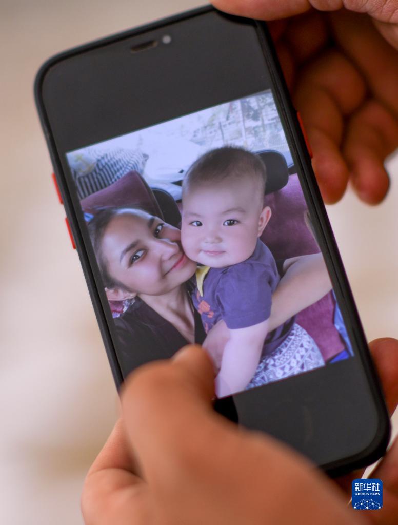 在中科院新疆生態與地理研究所策勒沙漠研究站,買爾當在翻看手機上妻兒的照片(6月13日攝)。新華社記者 王菲 攝