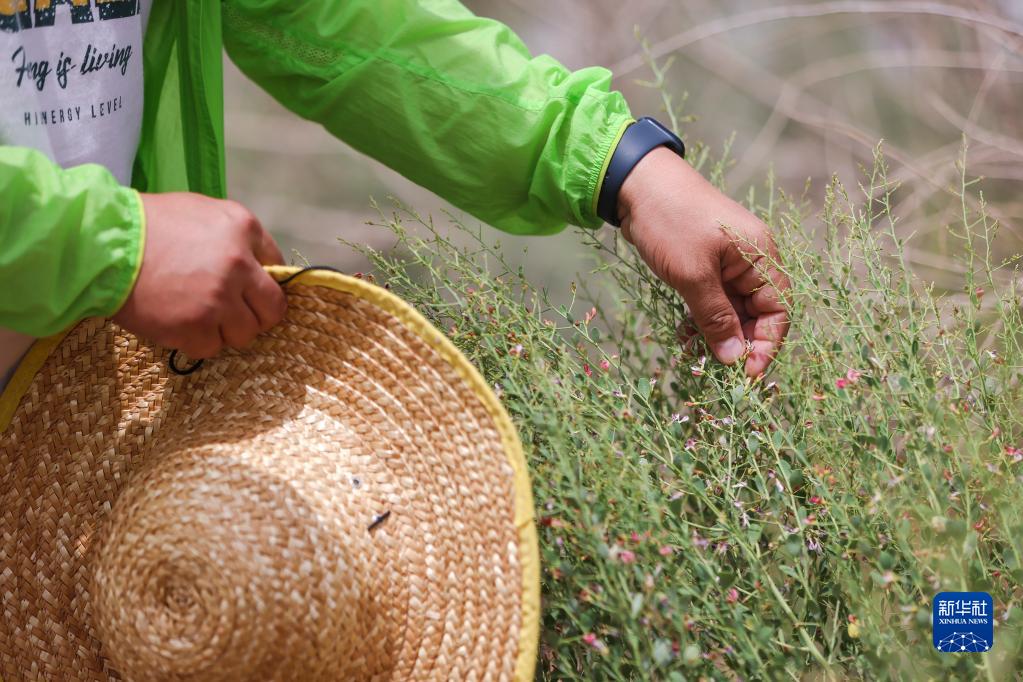 在中科院新疆生態與地理研究所策勒沙漠研究站天然試驗區,買爾當在查看駱駝刺的生長情況(6月12日攝)。新華社記者 郝昭 攝
