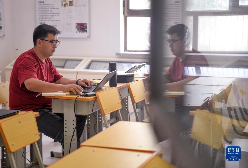 在中科院新疆生態與地理研究所策勒沙漠研究站,買爾當在整理分析觀測的數據(6月13日攝)。新華社記者 王菲 攝