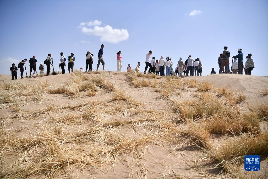 6月16日,留學生在寧夏靈武市白芨灘國家級自然保護區扎草方格。新華社記者 王鵬 攝