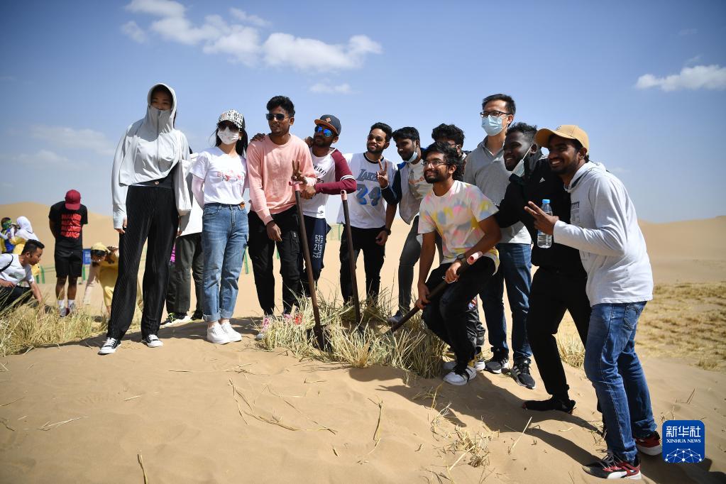 6月16日,留學生在寧夏靈武市白芨灘國家級自然保護區拍照合影。新華社記者 王鵬 攝