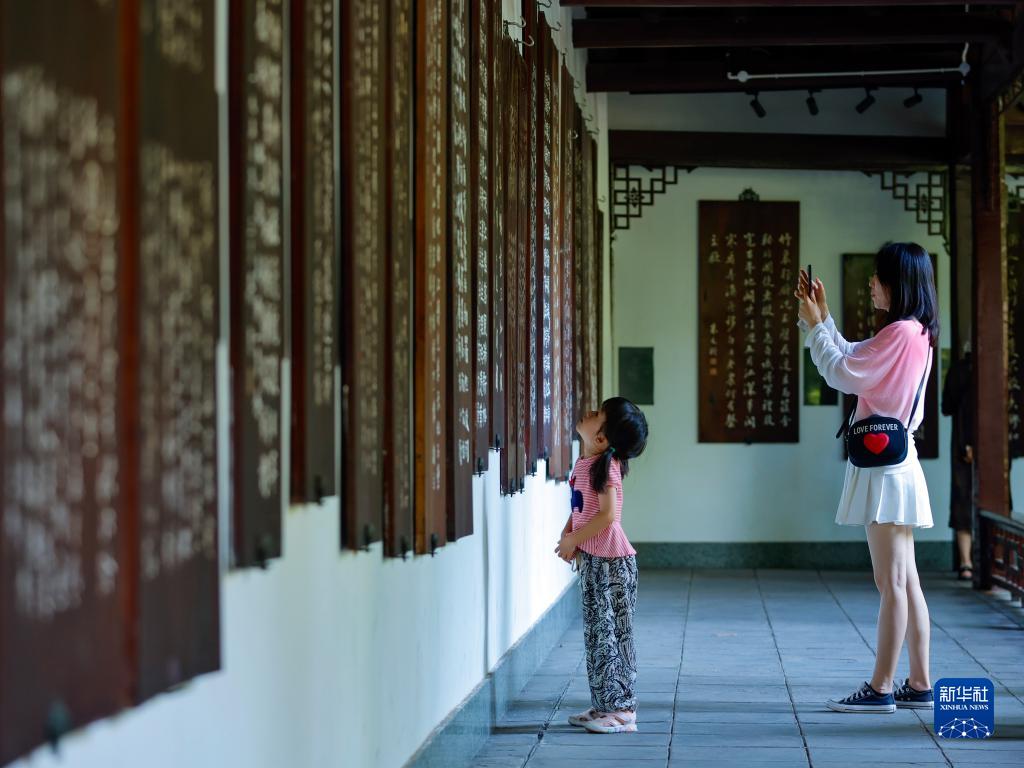 游客在杜甫草堂的杜詩書法木刻廊駐足欣賞木刻作品(6月12日攝)。
