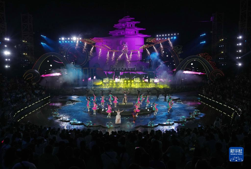 6月17日,在秦皇島市北戴河區碧螺塔酒吧公園,演員為游客表演海上實景奇幻秀《塔秀》。