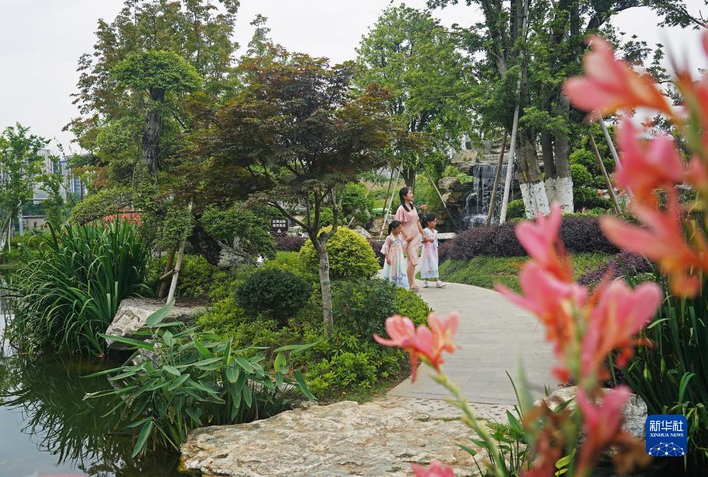 市民在以“地上花園+地下治污”設計理念建設的九江市雙溪公園游玩(6月15日攝)。