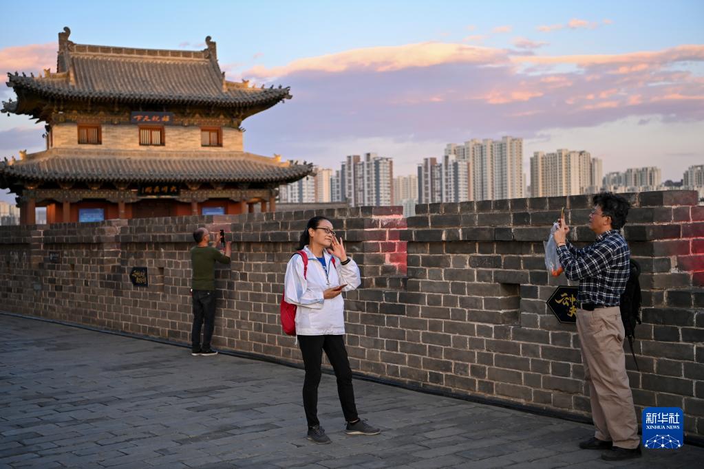 游客在大同古城墻上拍照(2023年6月8日攝)。