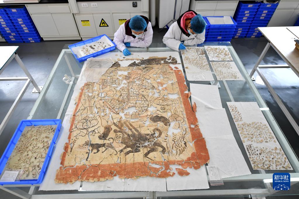 在山西大同云岡石窟研究院壁畫文物修復室,工作人員在進行壁畫修復(2021年5月9日攝)。