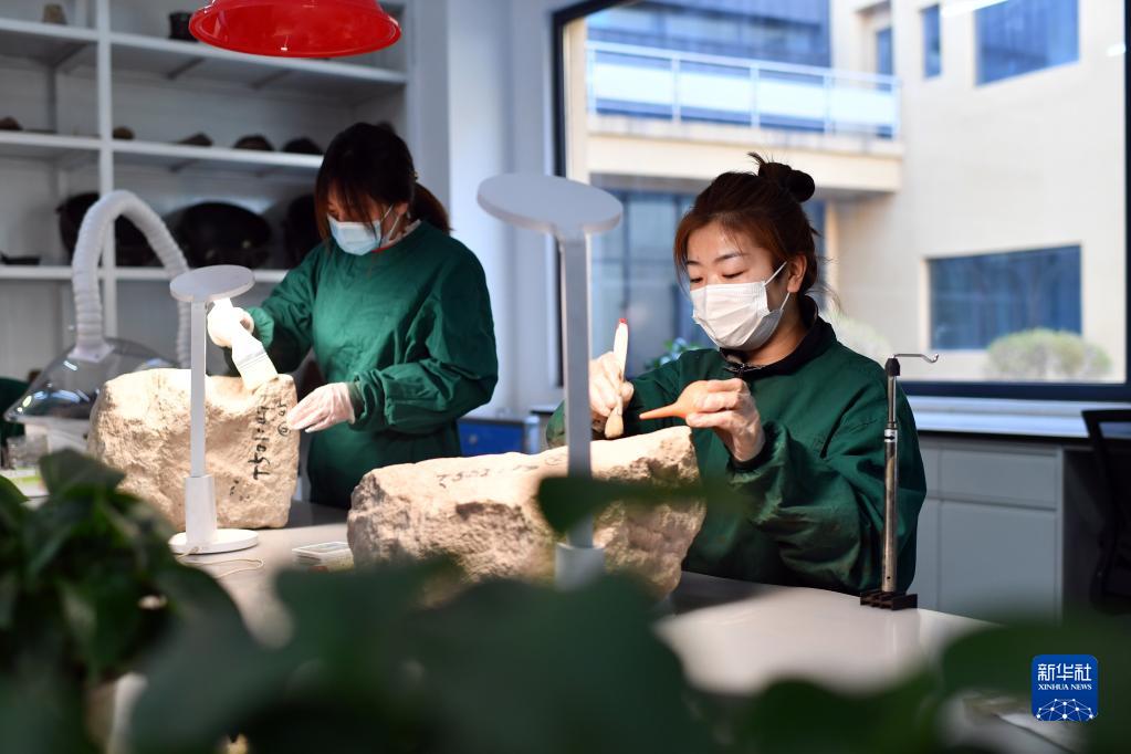 在山西大同云岡石窟研究院可移動文物修復室,工作人員在進行除塵作業(2021年5月8日攝)。