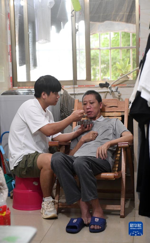6月17日,在廣西南寧,袁東旺在學校附近的出租房里給父親喂飯。