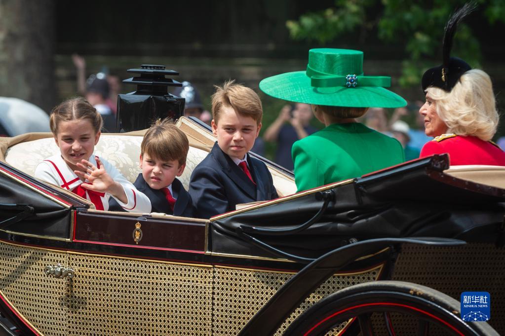 6月17日,在英國倫敦,喬治王子(左三)、路易王子(左二)、夏洛特公主(左一)乘坐馬車參加閱兵式。
