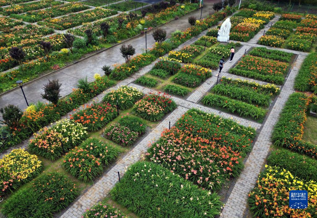 6月18日,人們在上海應用技術大學的植物園內參觀萱草花展(無人機照片)。