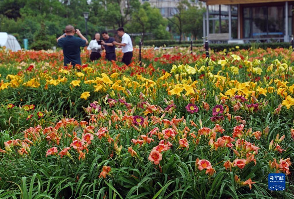 6月18日,人們在上海應用技術大學的植物園內參觀萱草花展。