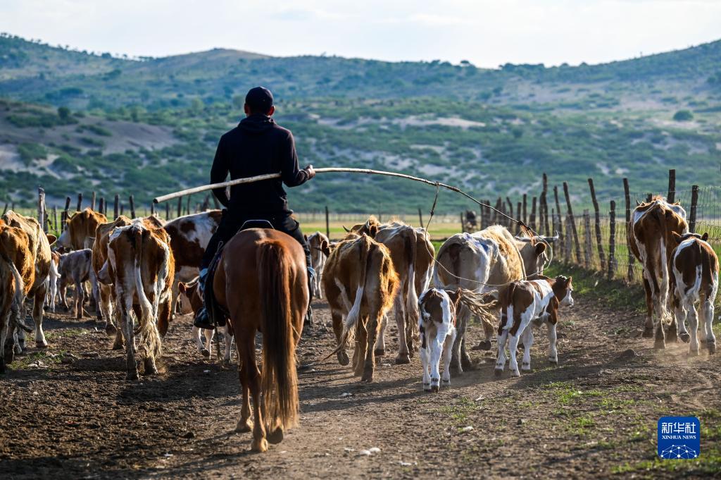 巴彥溫都爾蘇木的牧民額爾敦巴特爾今年51歲,他家的遷徙路程約60公里。6月14日,額爾敦巴特爾就開始全家總動員,收拾行囊、準備飼草料,為游牧轉場做準備。6月15日清晨,額爾敦巴特爾和妻子昂那莫德格、小兒子格日樂朝格圖一起聚集牛群、馬群,和他們的鄰居布和巴雅爾一家一同出發前往夏營地,留下大女兒照看家中老人。