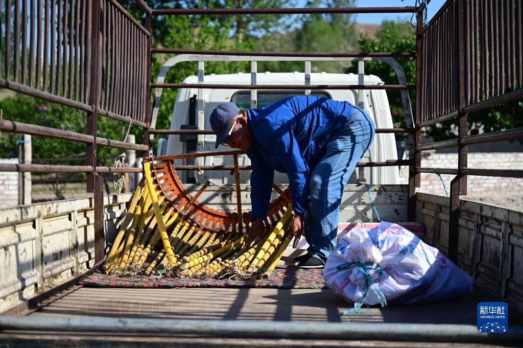 6月14日,額爾敦巴特爾將氈房的木制房頂裝車。