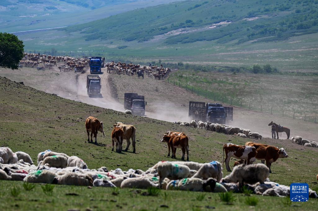 6月15日,牧民們趕著牲畜行走在遷徙路上。