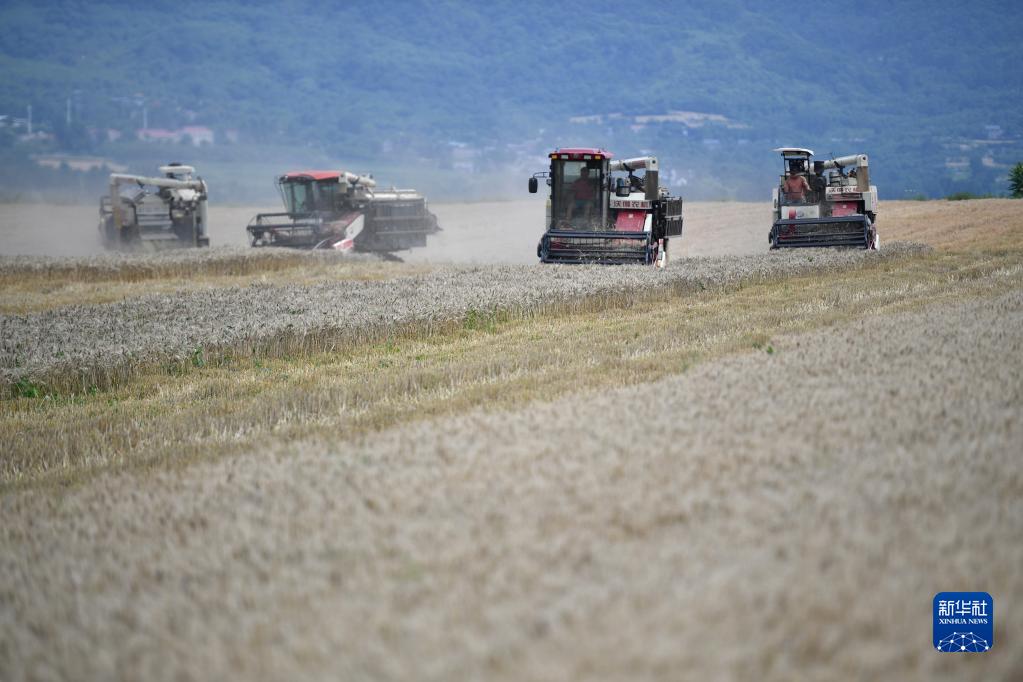 6月8日,長豐農機專業合作社社員駕駛收割機在西安市長安區神禾塬萬畝優質糧食生產基地內搶收小麥。