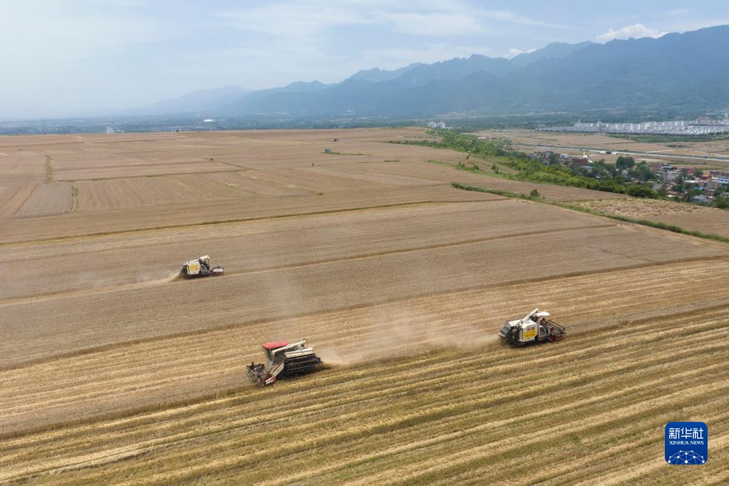 6月8日,長豐農機專業合作社的收割機在西安市長安區神禾塬萬畝優質糧食生產基地內搶收小麥。