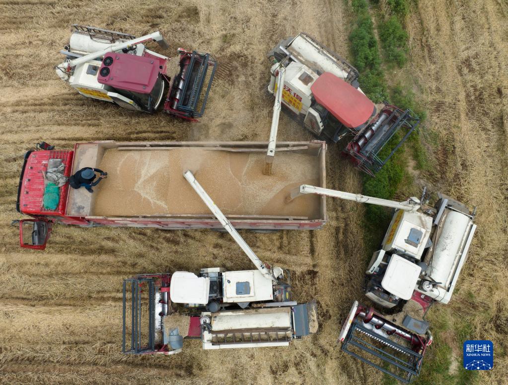 6月8日,長豐農機專業合作社的收割機將收獲的小麥裝車。