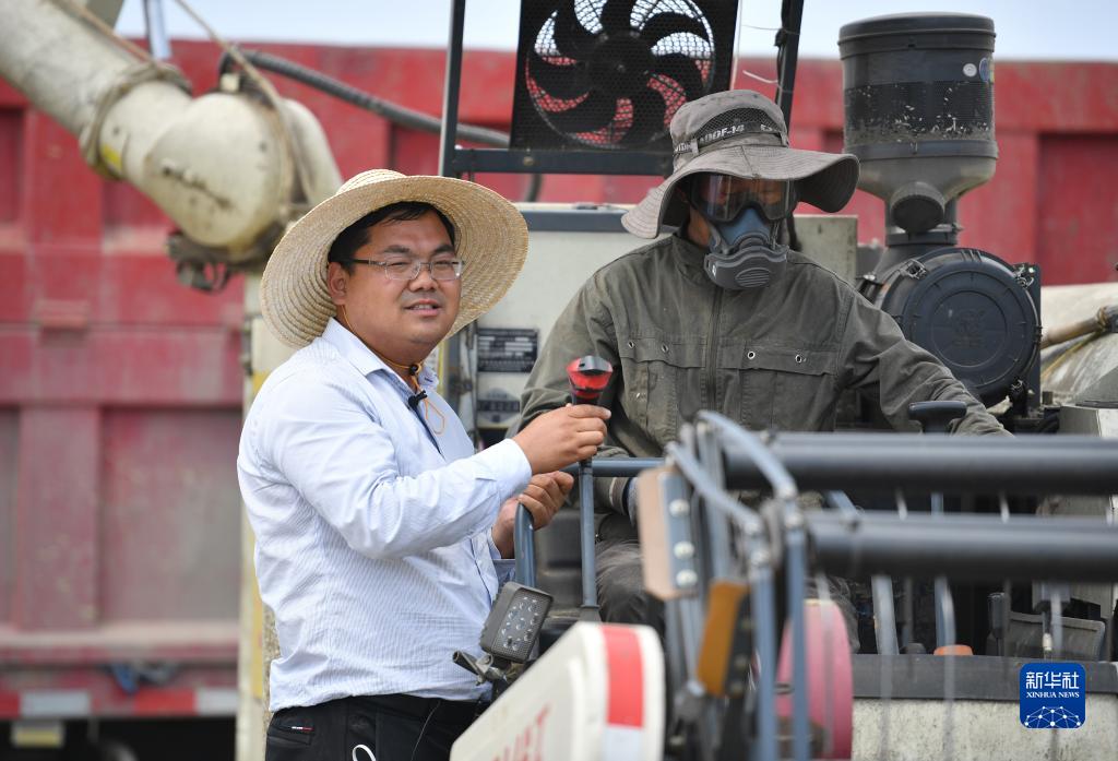 6月8日,薛強(左)在收割小麥間隙與合作社的一名農機手交流。