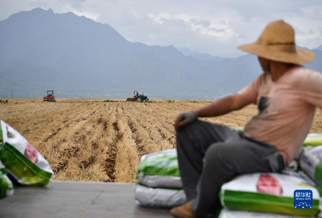 6月16日,長豐農機專業合作社的社員們在西安市長安區神禾塬萬畝優質糧食生產基地內播種玉米。