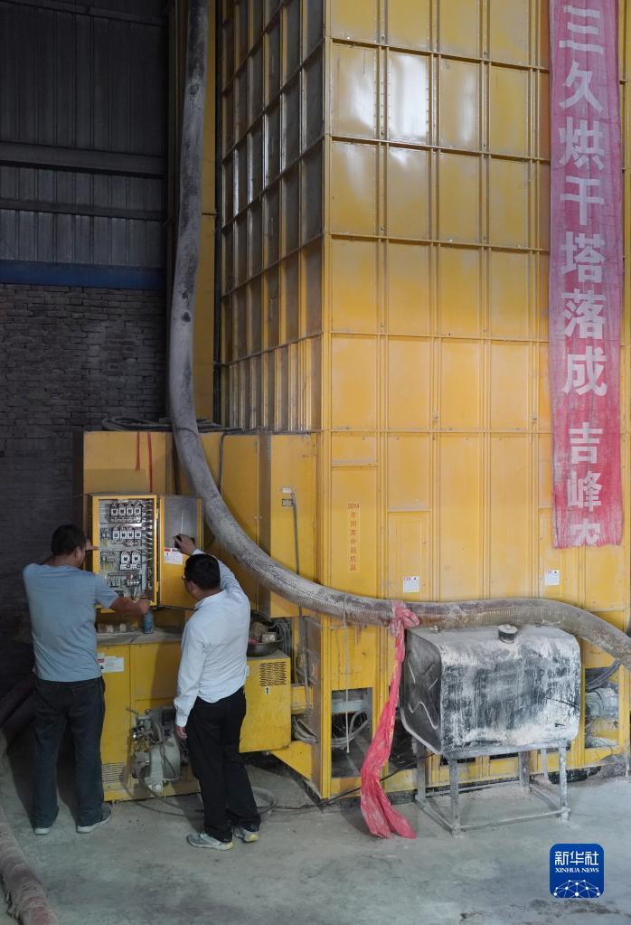 5月30日,薛強(右)與合作社的工作人員一起調試烘干塔,為麥收做準備。
