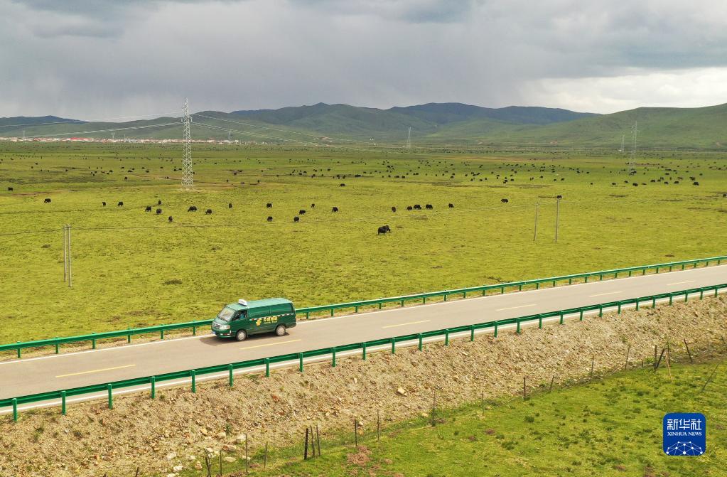 哈弄奪機開著郵車奔波在若爾蓋大草原的郵路上,為農牧民提供服務(6月14日攝,無人機照片)。