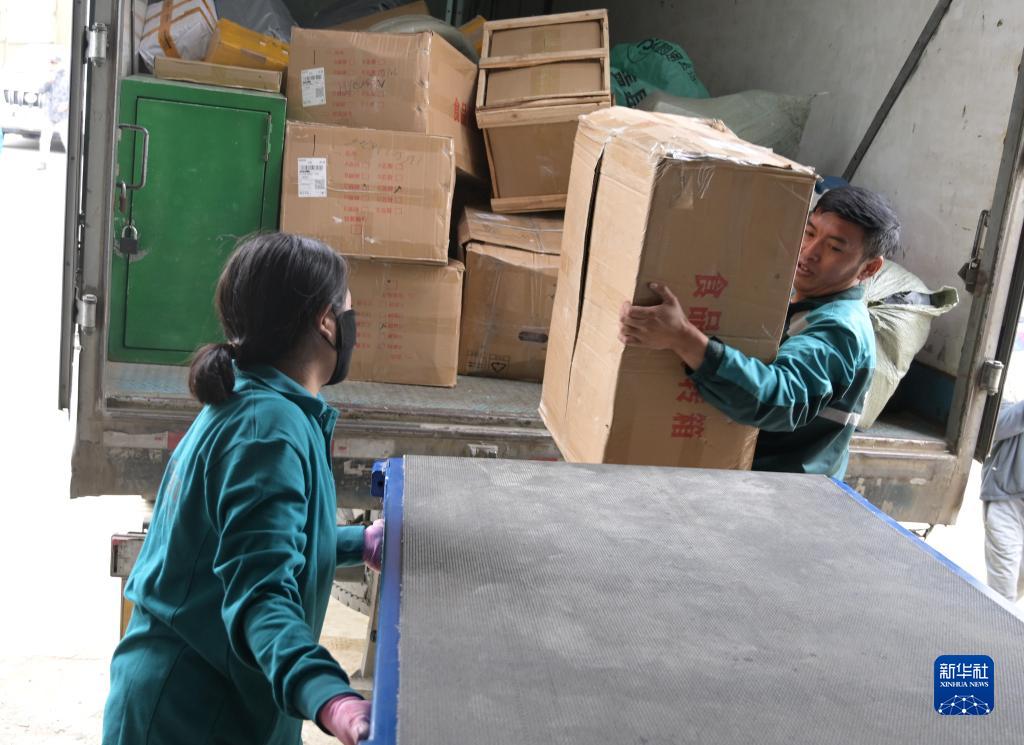 在唐克鎮快遞物流運營中心,哈弄奪機(右)和同事一起卸車(6月15日攝)。