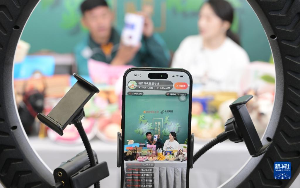 哈弄奪機(左)在郵政電商工作室直播帶貨(6月17日攝)。哈弄奪機在鏡頭前一改往日給人略顯靦腆的印象,說起本地的物產如數家珍。