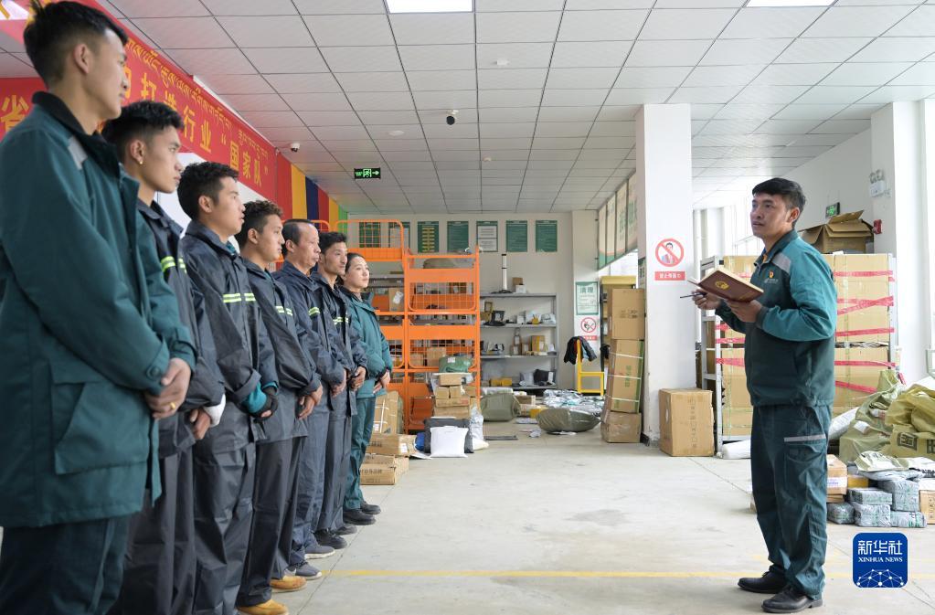 哈弄奪機(右一)在縣郵政快遞物流倉配中心主持出班前的晨會,向投遞員們安排任務(6月16日攝)。