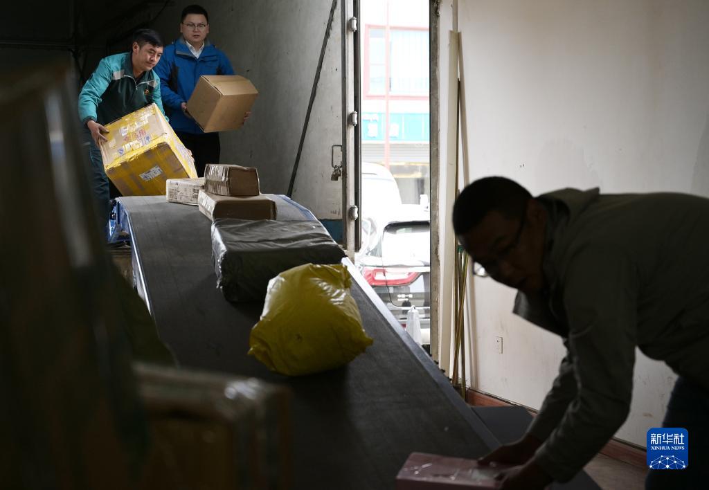 在唐克鎮快遞物流運營中心,哈弄奪機(左)和同事一起卸車(6月15日攝)。