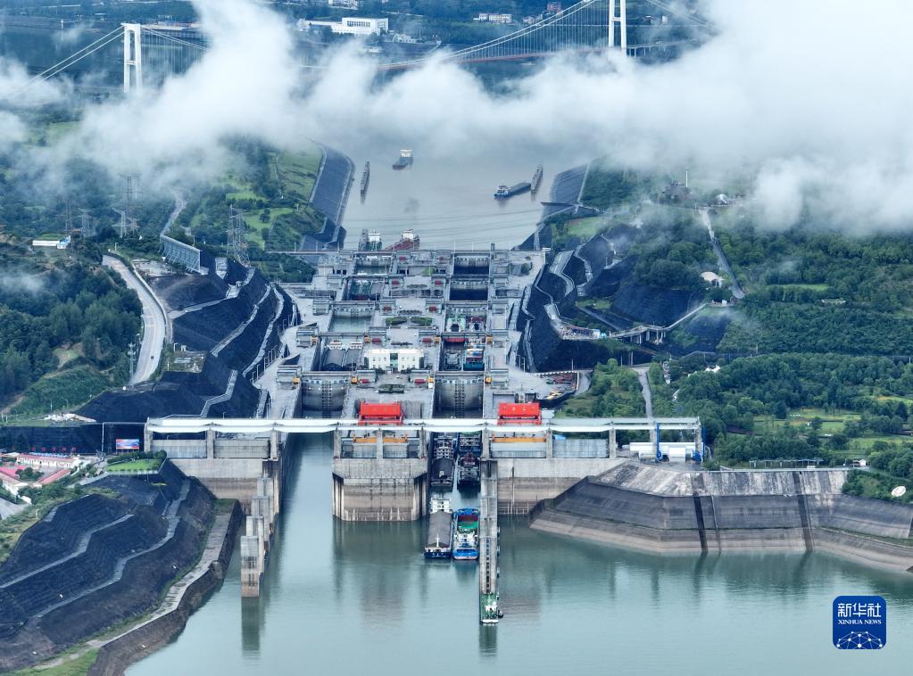 6月18日,船舶有序通過三峽雙線五級船閘(無人機照片)。