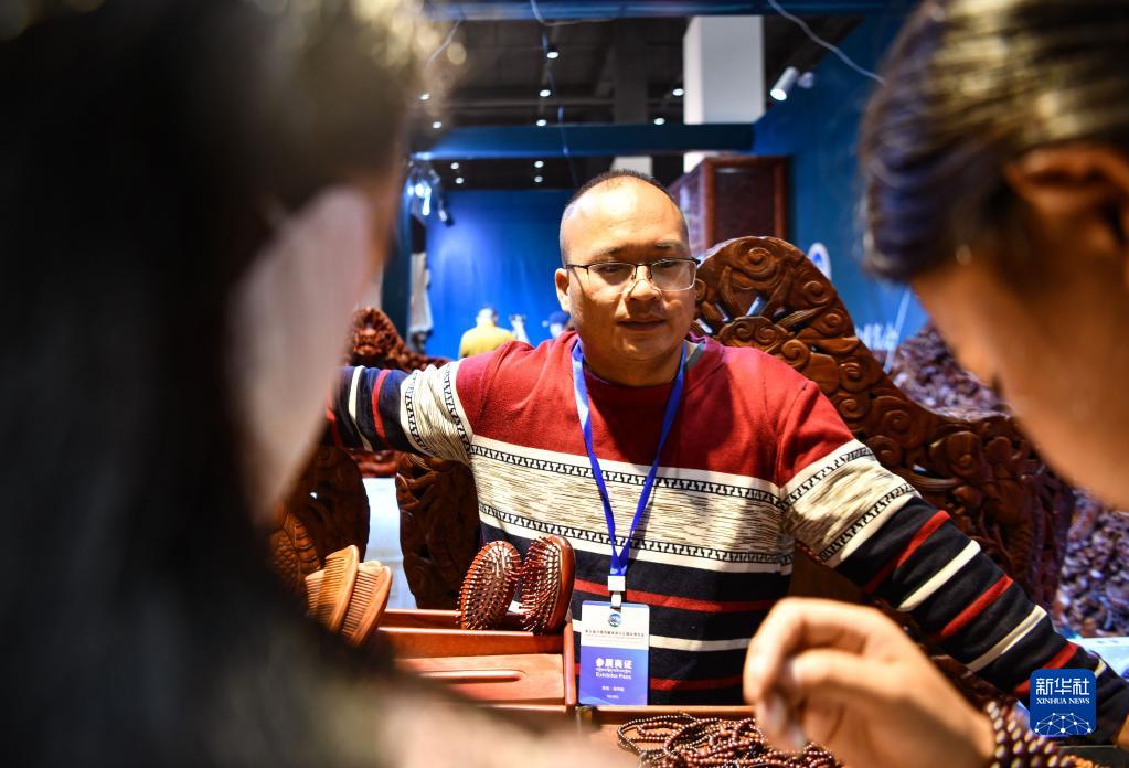 藏博會越南展位上的商人在銷售越南特色商品(6月18日攝)。