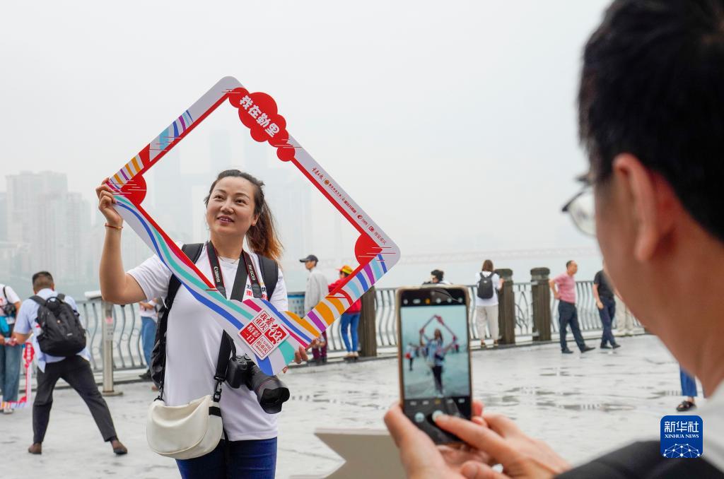 6月18日,參加活動的攝影愛好者手持主題相框在重慶市南岸區南濱路景區拍照留念。
