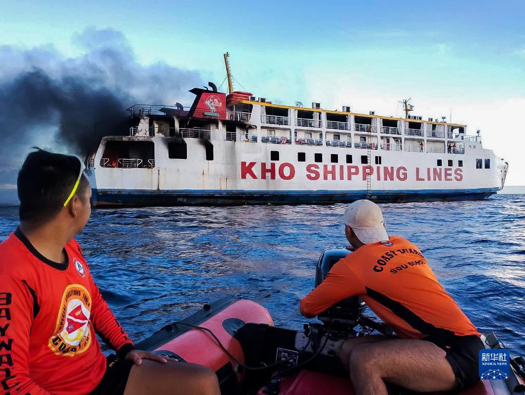 6月18日,在菲律賓保和省海域,海岸警衛隊成員看向起火渡輪。