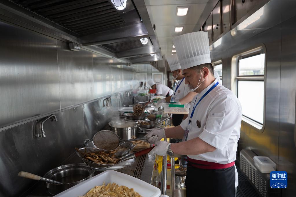 6月18日,在“林都號”旅游列車廚房,廚師在制作午餐。