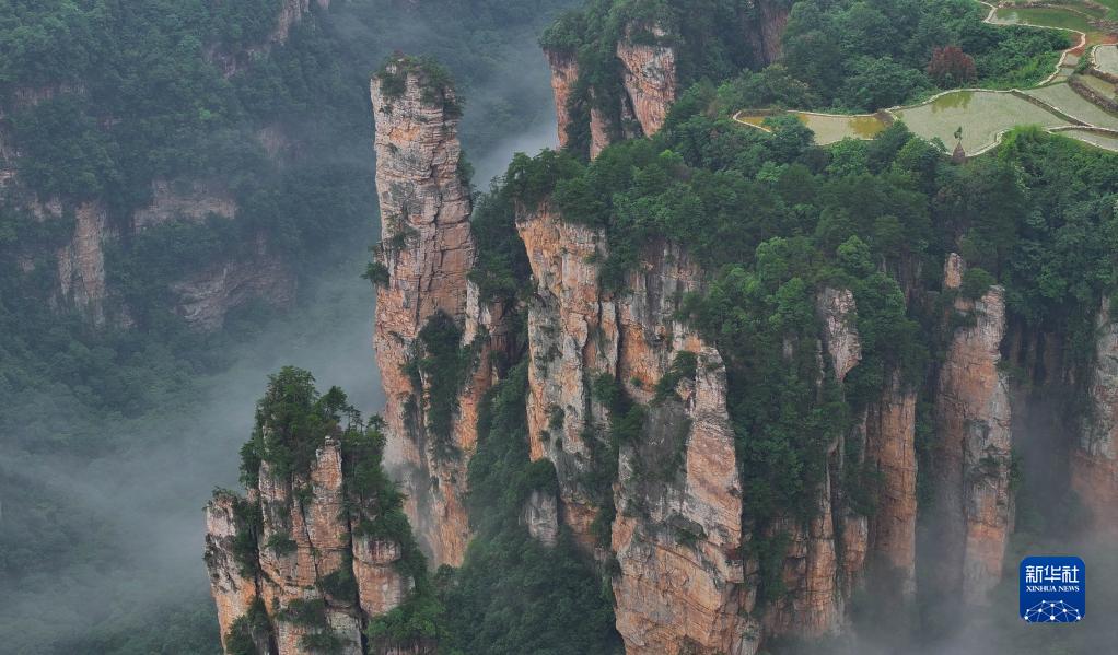 近日,湖南張家界迎來連續降雨。雨后,云霧在連綿聳立的峰林間飄蕩,懸崖峭壁之上的農田在云霧中若隱若現,構成一幅幅獨特的生態畫卷。