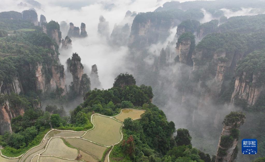 近日,湖南張家界迎來連續降雨。雨后,云霧在連綿聳立的峰林間飄蕩,懸崖峭壁之上的農田在云霧中若隱若現,構成一幅幅獨特的生態畫卷。