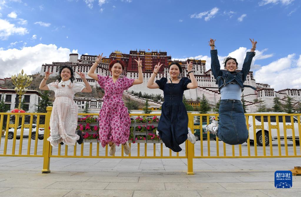 游客在布達拉宮廣場上合影留念(6月16日攝)。