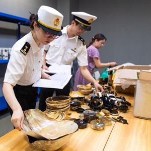 6月19日,在長沙國際會展中心,長沙海關所屬星沙海關關員在核對單貨。