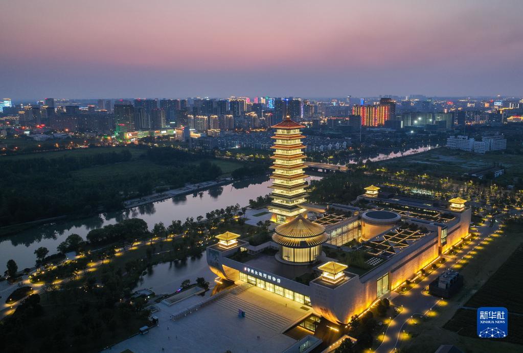 揚州中國大運河博物館和古運河相映成趣(6月14日攝,無人機照片)。