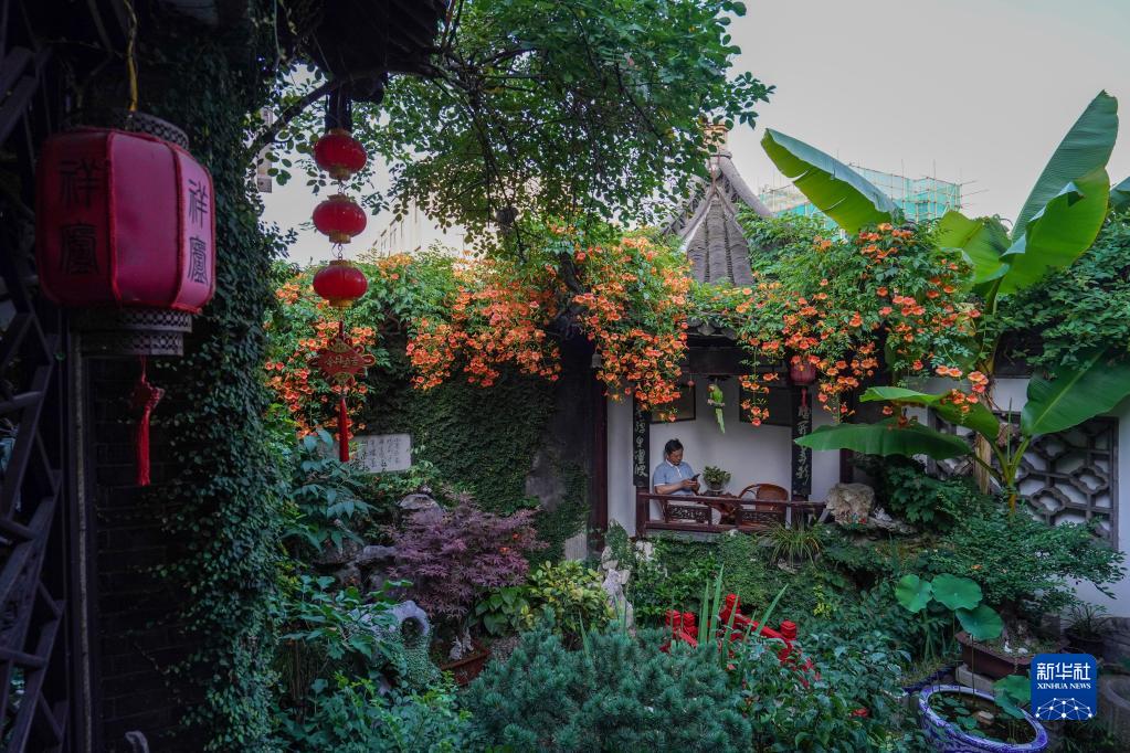 揚州市民杜祥開用自家平房與天井打造出“祥廬”,小橋流水,亭臺假山,錦魚暢游,匾額楹聯(6月14日攝)。