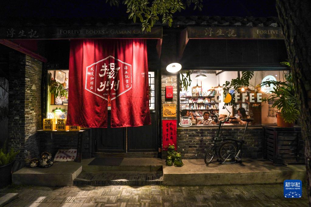 夜晚里揚州皮市街的書店燈火明亮(6月14日攝)。