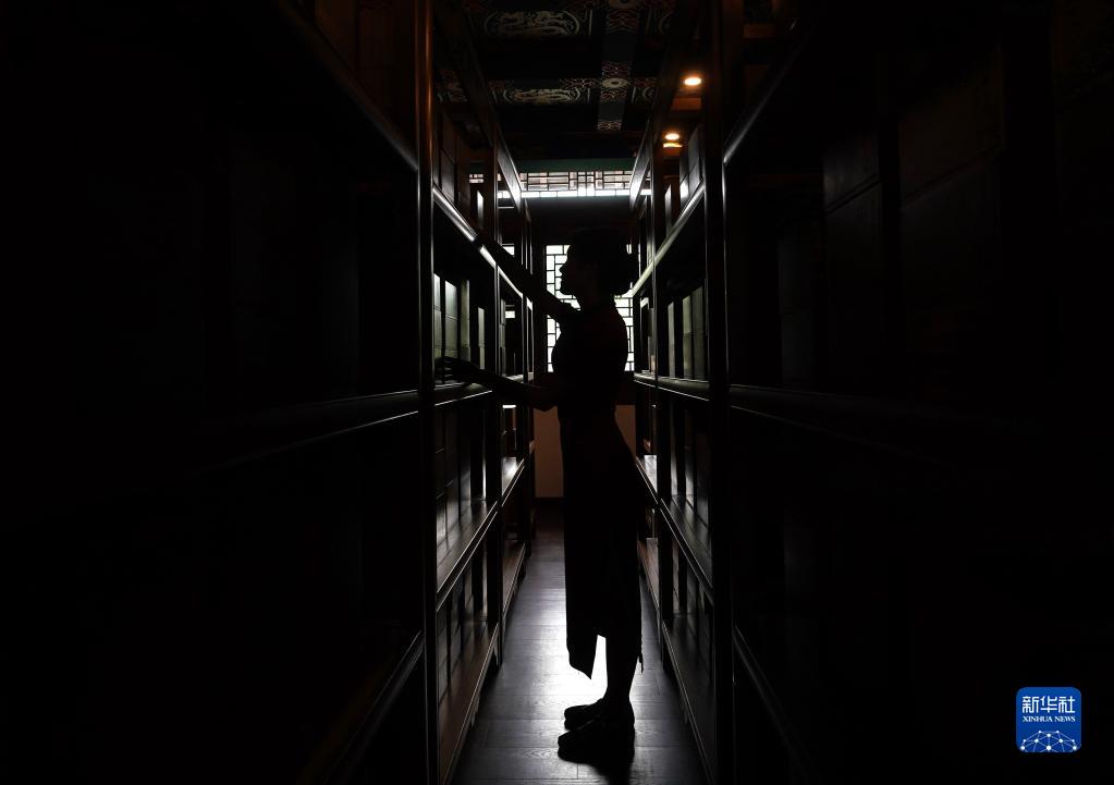 工作人員在揚州文匯閣內維護《四庫全書》(6月15日攝)。