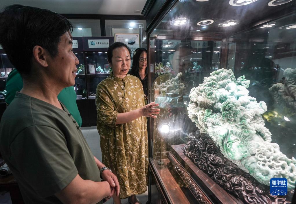 江蘇省文化遺產項目揚州玉雕代表人時慶梅(右)在工作室與工藝美術師們交流(6月15日攝)。