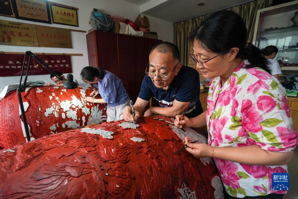中國工藝美術大師張來喜(右二)在工作室與同事交流制作揚州紅雕漆作品(6月15日攝)。