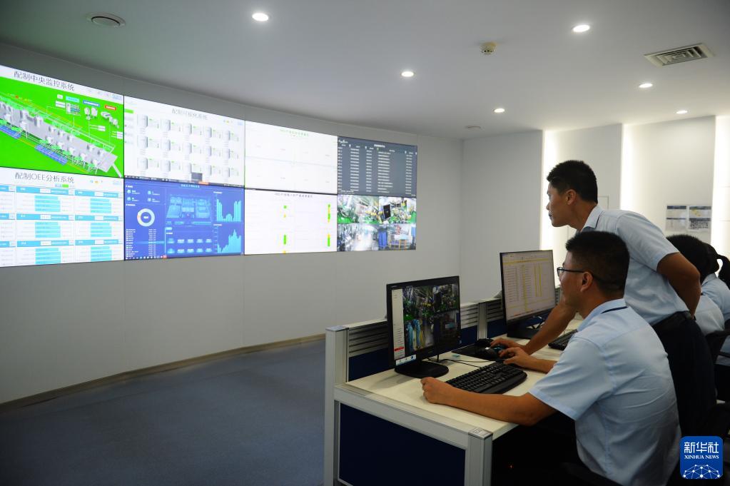 6月18日,在位于福建漳州的青蛙王子集團,工人在洗護工廠可視數據監控中心實時查看生產情況。